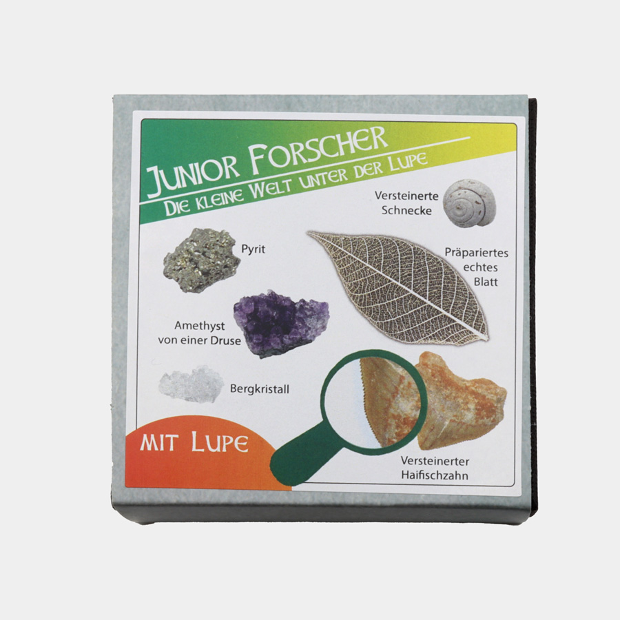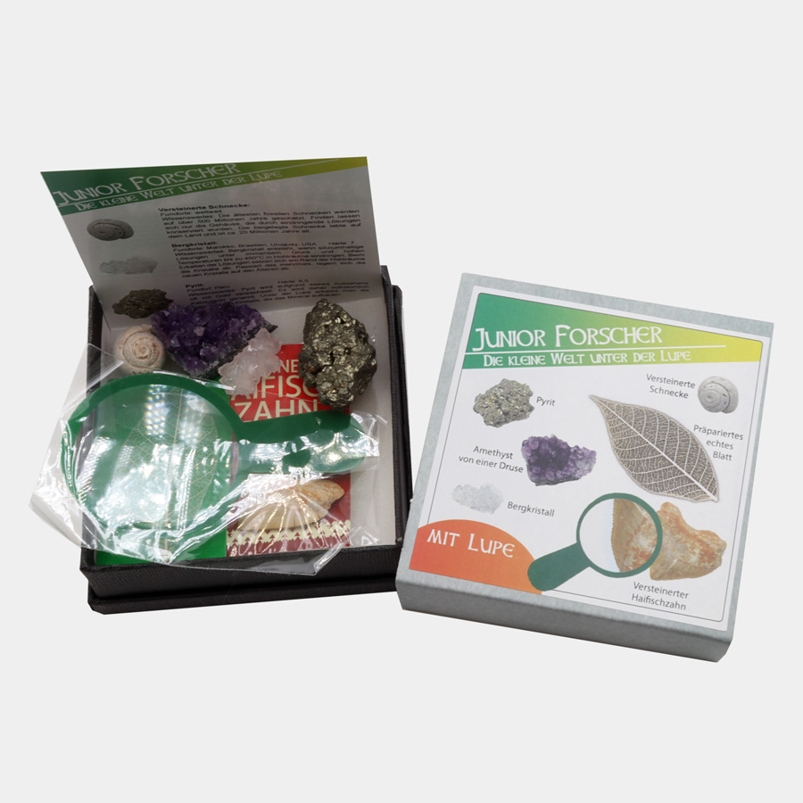 Die Geoboxen für (kleine) Entdecker – die kleine Welt unter der Lupe. Die Geobox besteht aus hochwertigem Karton mit einer Banderole. Die Boxen sind gefüllt mit verschiedenen faszinierenden Mineralien und Fossilien. Jede Box beinhaltet zudem eine Lupe und eine informative Beschreibungskarte. Änderungen in der Mischung sind möglich.