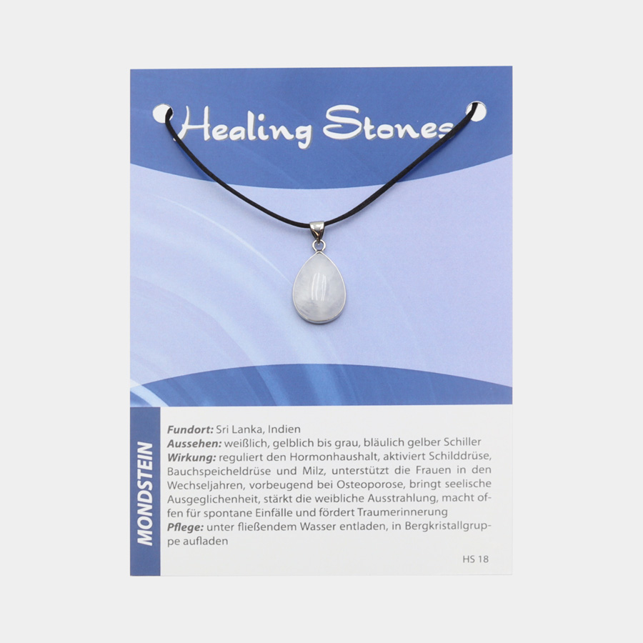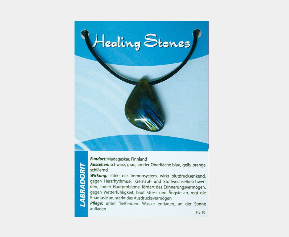 Die Healing Stones sind eine ausgesuchte Serie von 49 verschiedenen Edelsteinanhängern, denen bestimmte Heilwirkungen zugeschrieben werden. Die Edelsteinanhänger sind gebohrt oder mit Öse versehen und an einem Band attraktiv auf einer detailierten Beschreibungskarte mit Angabe zu Fundort, Aussehen, Wirkung und Pflege des Heilsteins in einer Zellophanverpackung drapiert. Die Karten können optimal im Wandhänger oder in den Drehständern präsentiert werden. Die Größe einer Karte ist ca. 10cm x 14cm.