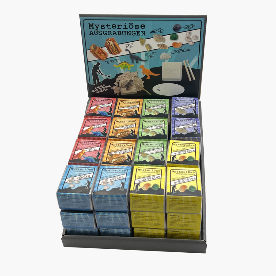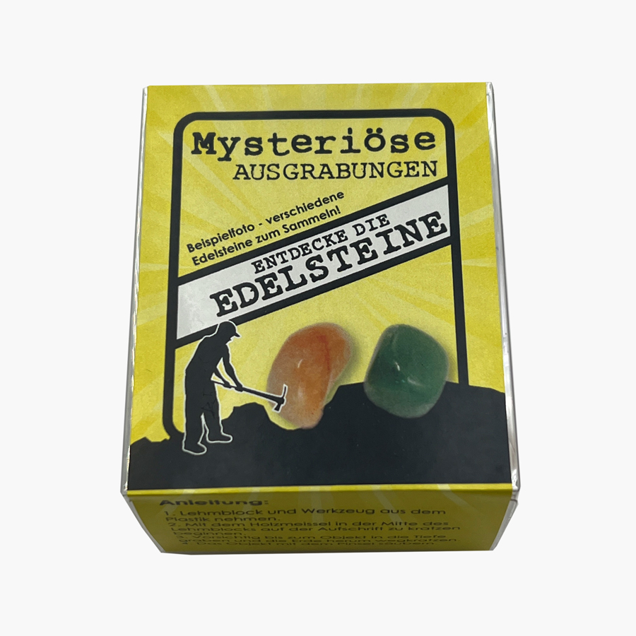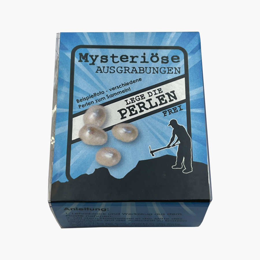 Die mysteriösen Ausgrabungen in der Box bestehen aus einem Lehmblock, geeignetem Werkzeug und einer Anleitung. Es sind derzeit 4-6 unterschiedliche Produkte in den Boxen (Edelsteine, Dino, Piratenschatz, Perle, Muschel, Katzengold/Pyrit) erhältlich. Wie ein Forscher Ausgrabungen frei legen.