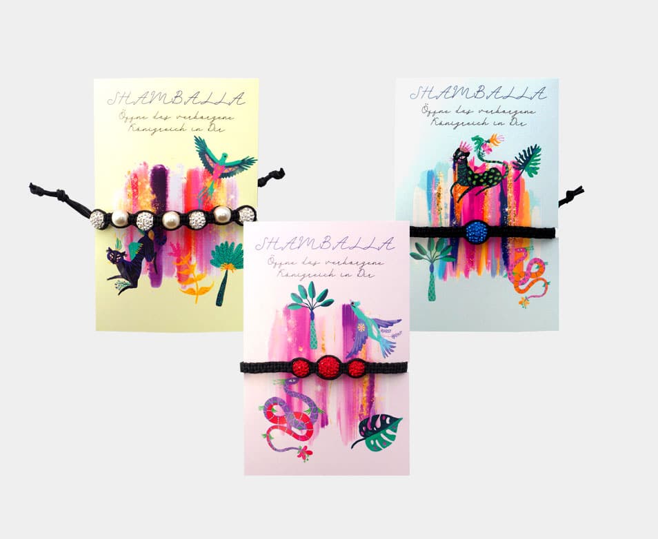 Die Shamballa Armbänder sind aus einem hochwertig geknüpften Freudschaftsarmband gefertigt und haben unterschiedliche glitzernde Schmuckanhänger. Die Armbänder sind ansprechend auf einer Karte drappiert, die Maße der Karte ist 8x12cm. Die Farben und Designs der Armbänder sind zufällig auf den 3 verschiedenen Designs der Karten sortiert. Einzelne Farben oder Designs können nicht speziell ausgewählt werden, die Lieferung erfolgt zufällig.