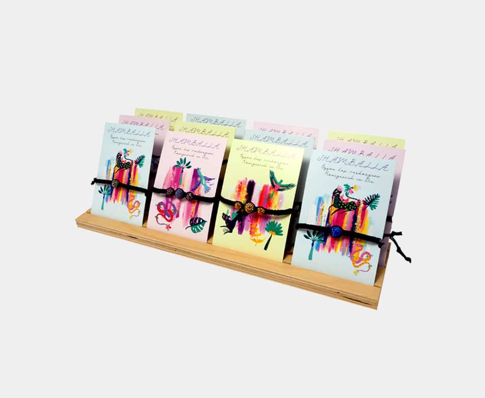 Das Holzdisplay zur Präsentation der Karten ist aus Multiplex Birke und hat die Maße L35cm x T9cm x H1cm.